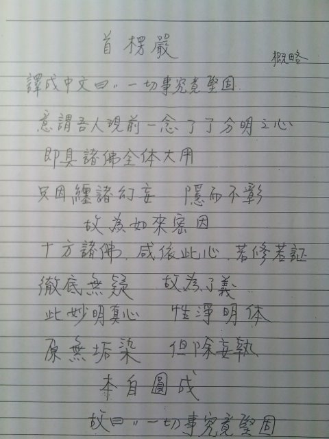 「首楞嚴」翻譯成中文叫做一切事究竟堅固,一切的事都是究竟,我們不生不滅的佛性本體是住在堅固之地。所以一切事究竟堅固就是首楞嚴。「概略」則是因為能讓我們用愈少的文字愈能夠記憶,所以用很少的文字把裡面所有內容講出來。