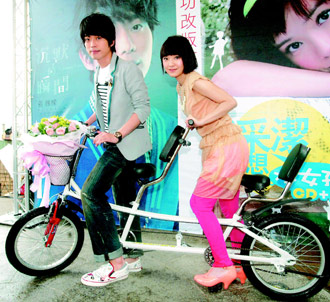螢幕情侶張棟樑、郭采潔,音樂路上攜手而行,昨天趕搭內湖捷運通車熱潮,在美麗華舉辦慶功簽唱會,兩人共騎協力車進場,深情合唱情歌,象徵同心協力創佳績,歌手為了保養喉嚨,幾乎不吃冰,在炎熱天氣下,他們同吃一碗剉冰消消暑。