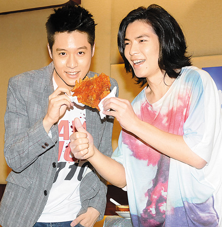周湯豪(左)辦出道演唱會,蕭敬騰送辣雞排給他,他一吃就猛咳。(黃