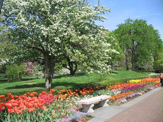另外大概因為天氣很好,陽光燦爛,所以也碰到不少老師帶著學生來參觀,替寂靜的植物園增添一些人氣,不過這些幼稚園或小學階段的孩子,多半無心賞花,逕自奔來奔去,使得老師得頻頻注意是否有脫隊的學生,和其他遊客賞櫻的優雅的氣氛形成強烈對比。除了櫻花,五顏六色的鬱金香也燦爛盛開,令我心裏不禁發出讚歎,春天景致真是太美了!