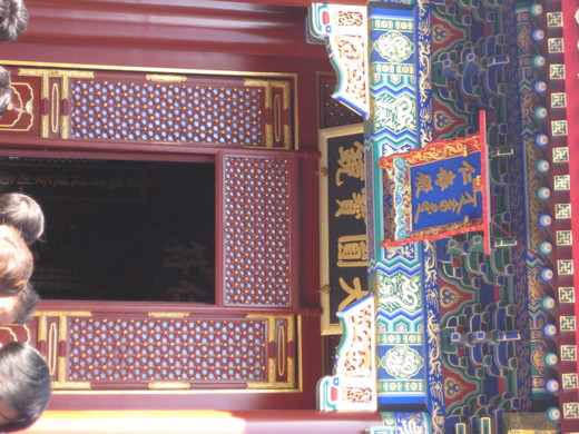 我們首先參觀仁壽殿,仁壽殿是皇帝 (光緒及慈禧)在頤和園時聽政的大殿(不過遊客只能在門口看) ,殿上屋簷末端裝飾有四百多個壽字,殿內寶座後的屏風上則寫有兩百多個字體各異的壽字。因為有整修過,整個建築外觀看起來挺新的但還好不至於太假 ,殿外院落則有龍鳳銅塑,本來應該是龍在中間,但慈禧是太后權力比皇帝大,所以就把鳳放中間。接著我們去德和園(慈禧看戲娛樂的地方),那裡主建築是三層樓高的大戲樓,據說是中國保存最好的木質結構的戲台,有21米高,每層有一提金字的匾額,看起來氣勢不凡,十分壯觀。我們去時有看到傳統歌舞及京戲的表演,挺有趣的。接著我們又參觀一些院落樓房,像文昌閣、文昌院(本來是御膳房,現在改為博物館,陳列原來頤和園中的收藏) 。