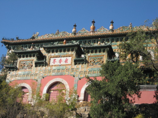 因為我們是從蘇州街方向去,所以是從後山上去,先到四大部洲,那是融合漢藏等民族風味建成的寺廟區,內供有三佛(如來、藥師、及阿彌陀佛)及十八羅漢,那裡地勢高低起伏不平,是石塊舖的路,不是太好走。接著到智慧海,那是一座完全由磚石砌成的佛殿,外层全部用精美的黄、绿两色琉璃瓦装饰,上部用少量紫色、蓝色的琉璃瓦盖顶,整座建築色彩鲜艳。殿外壁面的鑲有千余尊琉璃佛,叫“智慧海”是指佛的智慧如海。該建筑没有一根木料,全部用磚石砌成的,没有枋檩承重,所以称为“無梁殿”,又因殿内供奉了無量寿佛,所以也称它为“無量殿”。不過更令人印象深刻的是其前面五彩繽紛的牌樓"眾香界",在陽光照耀下絢麗奪目,閃閃發光,有置身仙境之感。