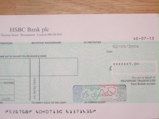 本來我一陣欣喜,並佩服倫敦當局對遊客投訴居然真的做出回應,沒有打馬虎眼。沒想到到銀行欲兌現時,行員卻告訴我因為是英鎊支票,得收三十美金手續費(有的說要收四十五美金)! 唉!真叫人傻眼,這明顯不合算嗎? 我也不禁覺得英國人辦事真是死板,不動腦筋,這也成為一張無法兌現的支票了!