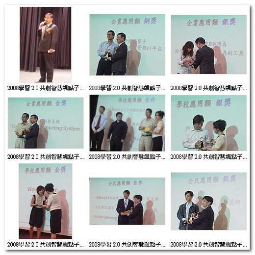 聽人家說,年齡常是個影響數位學習的關卡,我並不這麼認為,創意其實是沒有年齡限制的,在這個學習 2.0 共創智慧飆點子徵文活動頒獎典禮與分享裡,請為這些得獎人掌聲鼓勵吧!希望下次就是你-也祝福這些未來的菁英們一定要繼續為理想而努力!恭喜你們!(也更感謝辛苦的工作人員!)
