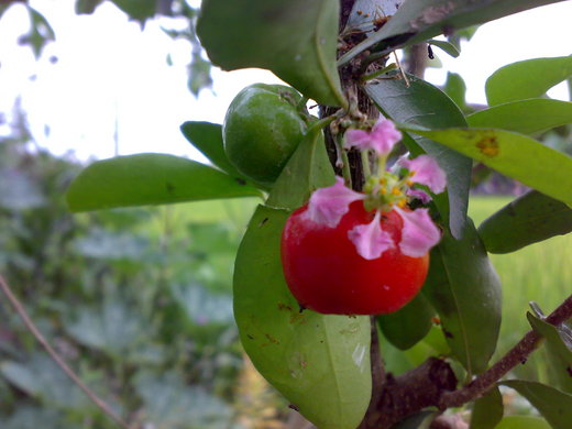 拿粒果實來看看,聞起來有淡淡的蘋果味,吃起來有一點點甜味,不會像西印度櫻桃~很酸~幾年前家裡也種過一棵西印度櫻桃,超會結果的,但也超酸的,把鄰家的小孩騙的哇哇叫,爸爸想說沒人敢吃,就把他砍了~
