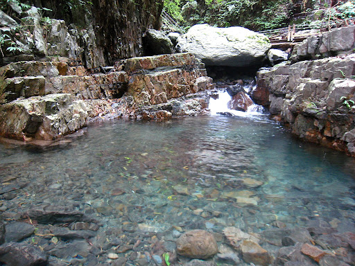 落差三十餘公尺的石盤瀑布,是得子口溪的源頭,在這塊大岩石邊沖激而下。