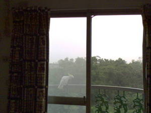 會租這裡,主要是第一眼給人一種詩情畫意的感覺,不論是庭園,或是從落地窗望出去,感覺蠻浪漫的,但是住了進來之後,就發現,其實沒那麼浪漫,這裡的住戶,是很難彼此有交集的,就算是偶爾見到,大家也不打招呼的,住我樓下那位住戶,養了一隻狗(從吠聲得知),它只要一聽見小聲響,就吠個不停,晚上,開著落地窗,有各式各樣的蟲鳴聲,重點是,早晨還會有一種不知名的聲音,朝朝叫你起床,初時,我總以為是烏鴉叫聲,直到那天清晨,被一種巨大的聲響吵醒(還以為是酷斯拉來了呢!),才驟然看到,原來一直吵著我的聲音,就是下方圖片中的這隻動物的聲音。