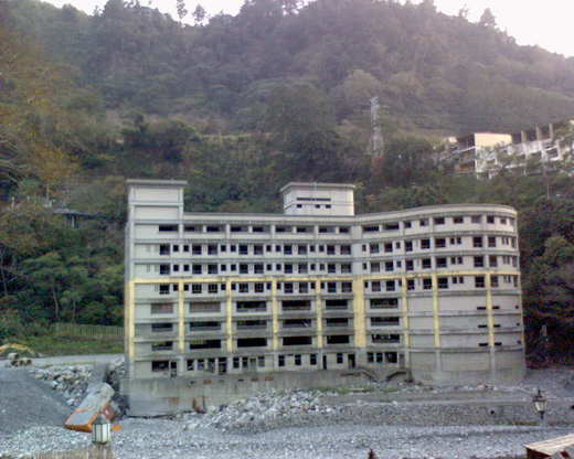 圖中本來是一棟非常富麗堂皇的建築,位於谷關,但是因為颱風帶來的災害,使它剛蓋好,還來不及營業,就已經成了廢墟,怎不令人慨嘆呢?難道人類還末省思到,大自然的力量,正蓄勢待發。