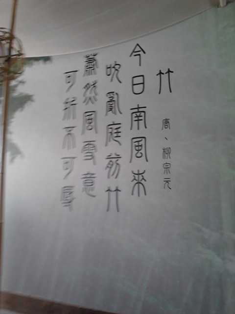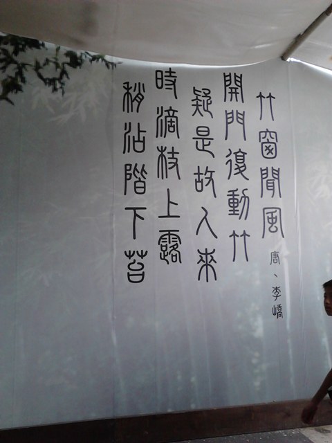 去過的人都知道,在美術館區往新生區的路上,會經過一個地方,特色是,全以篆體書法詠竹的詩(如所附圖片),一路一一拜讀下來,一直看到這兩句如此熟悉的詩句,映入眼簾──開門復動竹,疑是故人來──。