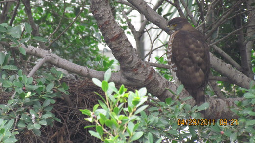 最近我們學校──前鎮高中,有老鷹來築巢,一時,成為焦點話題。這是一對的,這隻現在看顧小鷹,另外一隻出外覓食。這一對鳳頭蒼鷹在此築巢,孵育下一代,有許多難得的畫面,可惜拍攝時機是可遇不可求。