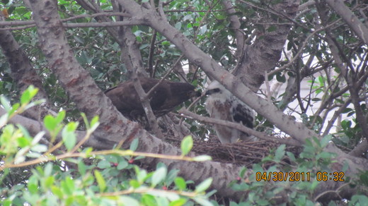 這兩天,一有空就去看,去拍,校慶當天,清晨兩點半醒來,就再也睡不著了,一大早,約六點左右,就來到學校想拍拍雛鷹在做什麼?一到定點,發現它正背對著我,它在看什麼呢?過了一會兒,馬上明白,原來剛才在等它的早餐,母鷹開始餵食。