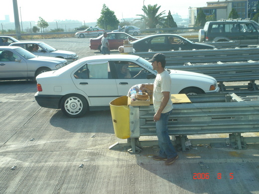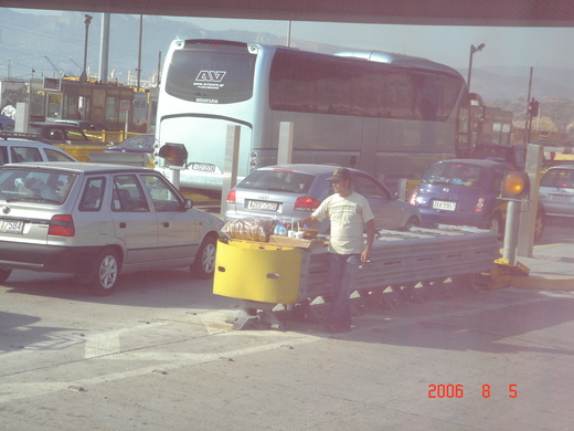 不可思議. 希臘的高速公路收費站前竟有賣早餐的小販