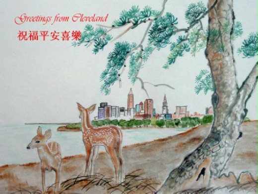 因爲我們住在克里夫蘭,靈機一動,不妨把小鹿移花接木到湖邊公園,而用城中心樓房作背景,再加上“Greetings from Cleveland”,來向朋友拜年,也和網友們分享。