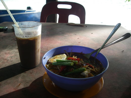 當我拿著照相機在沙灘上等拍太陽掉落海平面的剎那時,The Guest House owner(後來我才知道我住的Guest House只是他父親投資的多筆生意之一)恰巧也在岸邊出現,我微笑向他致意,他便走到我身邊告訴我Teluk Nipah的夕落多半在七點前後出現,他還說不遠前方有一處海灣長橋才是看Sun-set的最佳景點,問我想不想去瞧一瞧?他可以騎摩托車載我前往.基於我兩僅有幾面之緣,我便客氣婉拒他的好意,但是..........我的肚子卻是餓得拼命想插嘴,吃過早餐從吉隆坡出發後,僅在長途巴士上啃了一包當地的綜合水果(青芒果、鳳梨、芭樂),此時此刻的我實在需要飽餐一頓,好補充身體消耗迨盡的熱量,於是開口問他哪裡有簡單的餐點可吃?想不到這位先生就熱情領著我走向到他經常光顧的小吃店,問明我想吃麵或飯以及怕不怕辣後,隨即幫忙點了一碗馬來麵食和一杯冰咖啡給我,然後他也給自己端上一杯冰紅茶,又詢問我介不介意他與我同桌而坐?我難為情的......只好點頭讓他坐下,當我唏哩呼嚕的把麵、料都吃完後,他看著我碗裡剩下的湯頭提醒我說:其實那鮮紅的湯汁才是這碗麵最美味可口的要素時,弄得我亂尷尬的只好勉強吞下那大半碗比麻辣鍋還要麻、比紅燒豬蹄還要油膩的"精華"所在------------------天哪!我不知道我的體重會因此激增多少?但狼吞虎嚥完這時有蒼蠅同享的嗆辣麵食後,我突然想起自己看過的一部電影"地球是平的",那劇中主人翁不就因為一份印度"撮冰"而拉肚子拉到悔不當初嗎?!My God!!那我該不會也...............啊!不管了啦!反正該帶的腸胃藥我已悉數備齊,只要不是染上什麼需要上醫院的大病毒,我都得默默承受,誰叫我那麼肯定的回答人家說"我非常愛吃辛辣食物"哩?!所以連剛才蓄意留下的一碗湯頭也逃不過對方法眼的硬被愛面子的我給灌進無辜腸胃裡來了!現在才思考後果,為時已晚了吧!任性的Anne------------