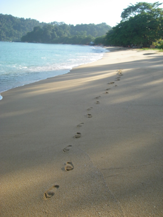 早上八點,我又來向印度洋報到,很顯然,看日出已晚,逐浪又嫌太早,只好取出書店出版手冊再次翻閱。旅行迄今鮮少賴床,想是心裡明白這樣悠閒的時光和等值的經濟預算恐怕是數年難遇一回,特別是今天,當我答應島嶼男人要出海伏潛.........心海裡竟是比印度洋翻騰攪擾,還沒坐上船,頭已開始暈眩,想起自己素有暈車、暈船的毛病,便猶豫待會兒要不要拿出來當道歉推托的藉口用?但一轉念又思忖到這是一座倚賴觀光收益度日的島嶼,如果當地住民都遇上像我這樣出爾反爾的"奧"客,那他們的生計將何以為繼?還是...........我現在就奔回旅店打包行李,給他來個不告而別,眼不見為淨?!可是........既然我已經答應了人家,現在後悔落跑,會不會有損臺灣國民的道德聲譽?天哪!我沒那麼偉大啦!什麼國民風範和信譽,那根本就不是心思打結的原故,我只知道明天中午自己就要離開"邦喀島"繼續往北馬"檳城"開跋,我走後,沒有人會記得我是誰,也沒有人會知道我曾經駐足這座寧靜島,且在Teluk Nipah Beach度過三個閑逸的白晝和詩畫般的夜晚,我窸窸窣窣的逃離,不會製造多餘聲響,就好像我悄然來到,未嘗掀起一道波瀾,沒有人會被驚醒,除了這片海,聽過我淚如雨下的獨白,除了綿亙金沙迤邐長空下形單影隻的一排足跡,連薄雲與我擦身後也如過客飄散杳逝,我現在離開,海風將不及通報,島嶼尚未甦醒,一切似乎都還來得及--------------------------