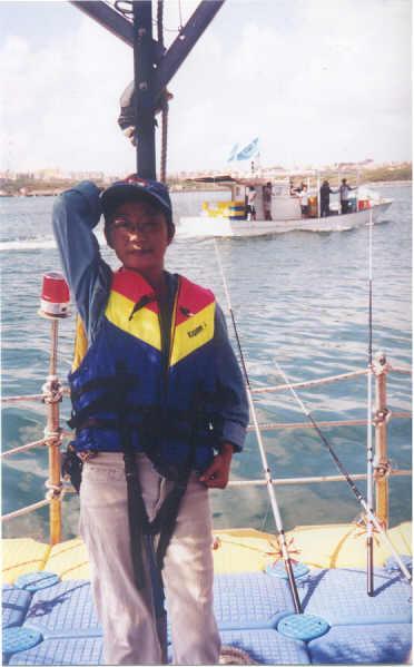 導遊要我們先穿上救生衣,再分批坐上遊艇直奔海中央去參觀海田:「有蚵的養殖場及海鱺魚養殖場----船上的服務人員還拿飼料要讓我們餵食海鱺。」