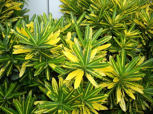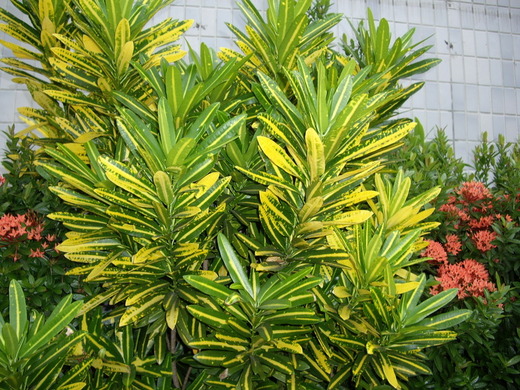 2. 葉:葉互生,肥厚而平滑,葉形有倒卵形、倒披針形、倒卵狀長橢圓形、螺旋形乃至線形等,外觀極富變化,葉面散生各種形狀和顏色之斑點,色彩鮮明艷麗,如黃 、紅、紫紅、橙紅、綠、黃褐色等;依葉的斑塊可分為覆輪、中斑、切斑、星斑、肋斑、島斑等;由於葉片富於變,故稱之為「變葉木」中肋及側兩面均凸起。
