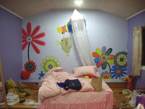 原本花樣是要漆在床正前方的那面牆,但是阿轟不知哪跟神經有問題,給他搞到床後面去了。