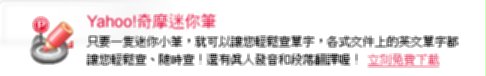 因為阿轟幾乎每天打開電腦都會上雅虎的字典去查詢一些單子,這讓我很困擾因為每次都要重新進去。不過現在雅虎最新提供的yahoo!奇摩迷你筆,可以讓你的字典出現在桌面上隨時差詢呢!