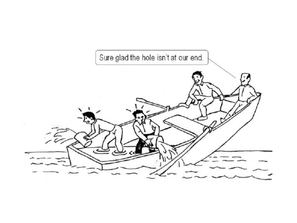 我們同在一個組織、企業、社會、國家、或地球裡生活或工作,往往只會關注自己看得到或負責的局部,對別人或遠方發生的事情漠不關心,認為與自己無關,或距離自己還很遙遠,卻忘了我們同樣處在同一條小或大的船上。