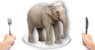 一頭巨大的象若要讓一個人動刀叉去吃,如何一下子吃下?任誰也沒那麼大的胃可容納得下。答案其實很簡單,一次吃一小口,日子久了,就可吃掉一頭大象。所以有一句英文諺語說:“How do you eat an elephant? One bite at a time!”「你如何吃下一頭大象,一次一小口!」