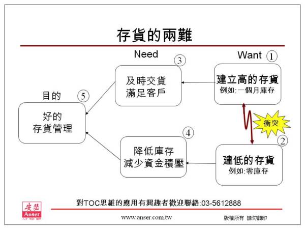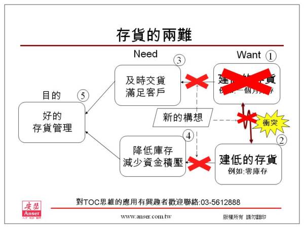 如何化解這存貨高低的兩難,就需要仔細檢視此衝突圖中的一些管理思維和假設。例如傳統上存貨管理人員直覺上認為為了及時交貨,滿足客戶,就必須要建高的存貨,例如一個月的庫存?這樣的假設是否成立?是否合乎邏輯。舉個例說,一般人都同意,如果要成功就一定要努力。這句話背後的邏輯是假設努力是達到成功的唯一或必要條件。但反過來思考,凡是努力的人就會成功嗎?答案卻不盡然。因此可從另一角度思考,除了努力以外,還有那些條件可以成功?那麼要達到「成功」的條件就不只一項,例如機會、能力,本身的條件等還有其他的事項。