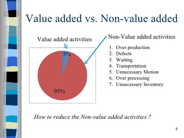 非附加價值(non-value-added)是指在生產或提供服務的過程中,產生對客戶不具價值的作業或流程,客戶不會為之付款,例如等待、搬運、不良品、檢驗等。這些沒有附加價值的作業或流程,都是種浪費,應設法消除。從消費者的角度來看,供應廠商會發生哪些非附加價值的作業或流程?