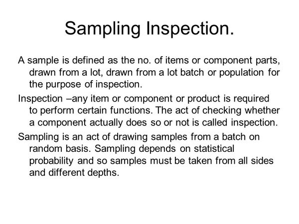 抽樣檢驗(Sampling Inspection)是對一批貨品以隨機的方式抽取一小部分,以此來反應或估計整批貨品的品質水準,通常是以統計的方式來呈現。若抽驗的不良品低於某一原先設定的百分比,則判定該批貨為允收,否則即判定拒收。抽樣的對象包括進貨的原物料、在製品、成品等。生活中一般消費者是否也使用簡易的抽樣檢驗方式對商品的品質作確認?