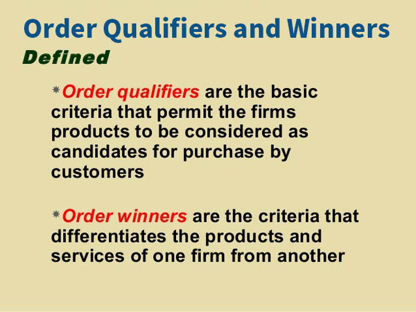 訂單合格者(Order qualifier)是指一家廠商其提供的產品服務在市場上具有競爭的優勢,因此在客戶選購時會列入考慮。例如買方採購在選購某一項產品時,會先搜集五家可能的供應商,但是在考慮交期、品質、成本、和服務等因素後,選擇其中三家議價,此三家即為訂單合格者。一般消費者在採購日常用品時,是否也有訂單合格者的概念?