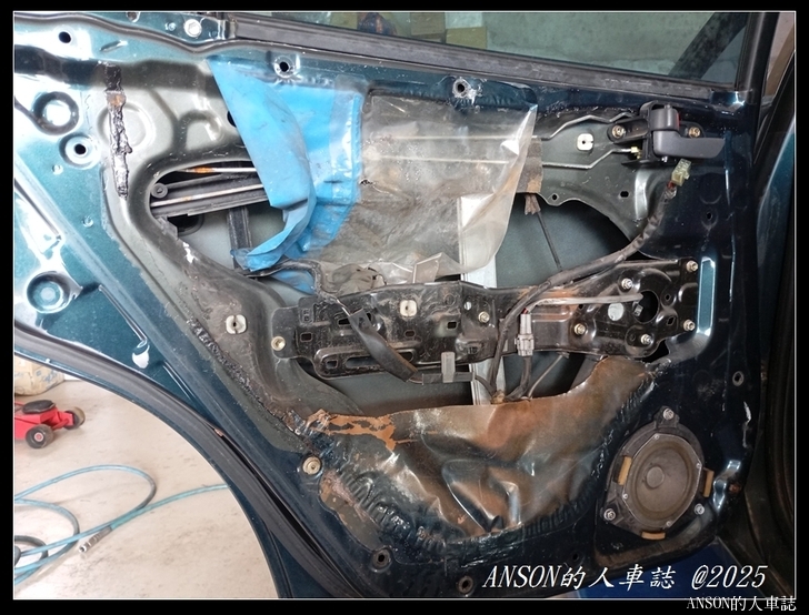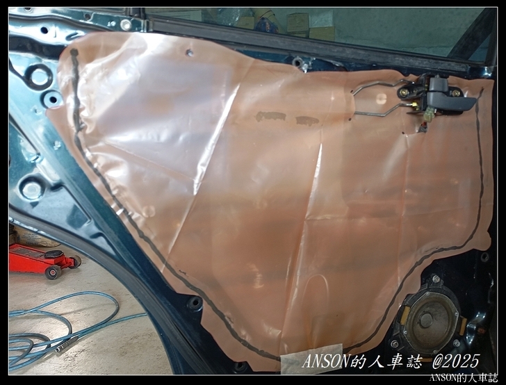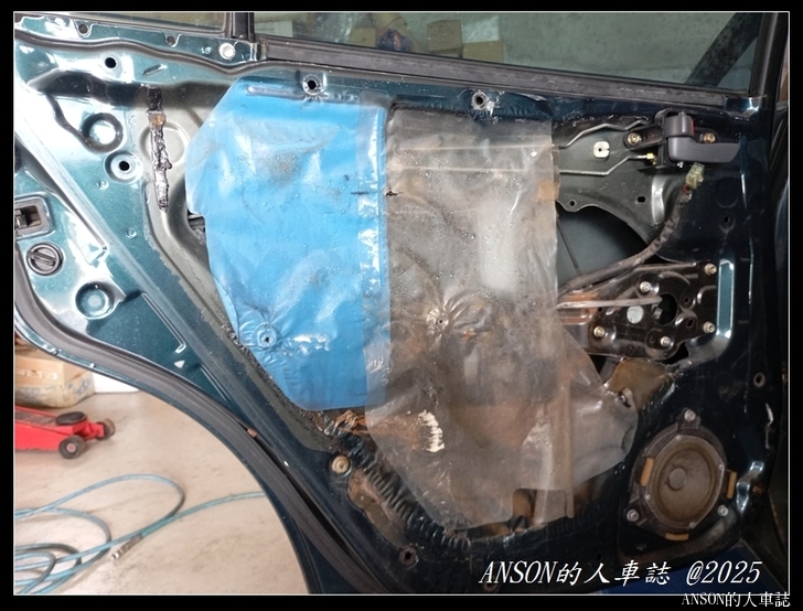 左後門板內防水布破損只剩半張