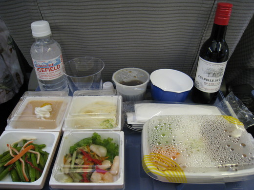 機上的餐很豐盛, 每個盤子上還附贈一瓶礦泉水, 甜點水果都很可口..