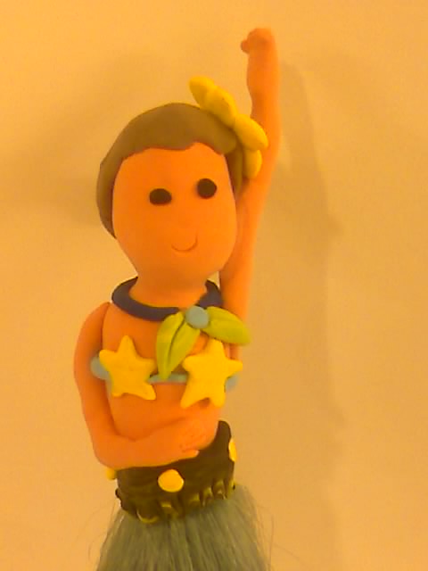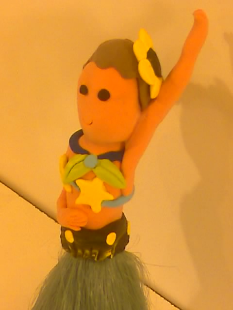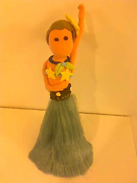 今天Melody帶回來的作品, 是一件紙黏土的夏威夷女郎雞毛毯子..