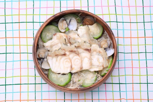▲使用鋁箔紙或鋁盒包裝,再放入龍膽石斑切片、生態蛤蠣、少許切片絲瓜、少許薑絲,可依個人喜好加入些許的白酒與開水,可提升食材的鮮甜,別有一番風味~
