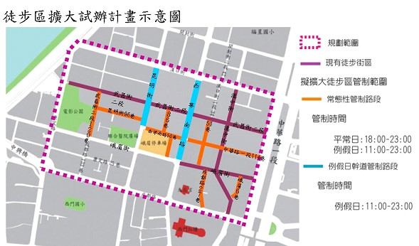 北市都市更新處表示,廿二日舉行應變會議後,會再針對周邊商家加強宣導,讓民眾知道徒步區擴大試辦計畫,管制路段路口加強宣導告示,讓行駛西寧南路、昆明街的南北向穿越性車流提前改道,避免誤闖管制範圍。