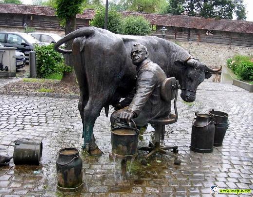 這是一個位於德國南部小鎮的一座雕像,奶牛代表人民,擠奶的坐在辦公椅上代表政府官員,政府從百姓身上獲取財富,可惜擠奶的桶子都是漏的,更可惡的是左邊還有一隻貪嘴的貓偷喝牛奶。這座雕像調侃地揭示了社會本質,讓人會心一笑後又感慨不已