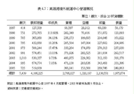 此一限制,可從前文所述之高雄港與上海港表現的第二次背離現象再度觀察。自從1997年高雄港境外航運中心開始營運後,高雄港的貨櫃裝卸成長量開始恢復上揚,連續三年均超過百分之十之年成長量,一掃高雄港表現長期下滑的陰霾,尤其是相對於上海港在1997年與1998年的成長量下滑的趨勢[vi],高雄港的逆勢成長更是難能可貴。並且從高雄港境外航運中心的表現中(表4.7)發現,其貨櫃裝卸的年成長量非常驚人,除了第一年(1998年)由於前年的數量僅從五月份後起算,因此達到113.92%的超高成長量外,其後連續四年的年成長量都在百分之十以上,顯示對於境外航運中心此一創新安排的制度需求(institutional demand)有多高,特別是其年成長量固定超過高雄港總體裝卸年成長量一段距離的現象,此制度所帶來的連動效果想必更為驚人[vii]。