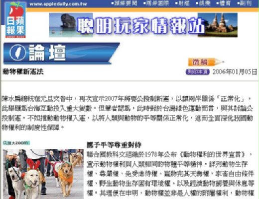 - 4樓. Joss2006/05/07 17:03說實在的,動物權入憲?太遙遠了。