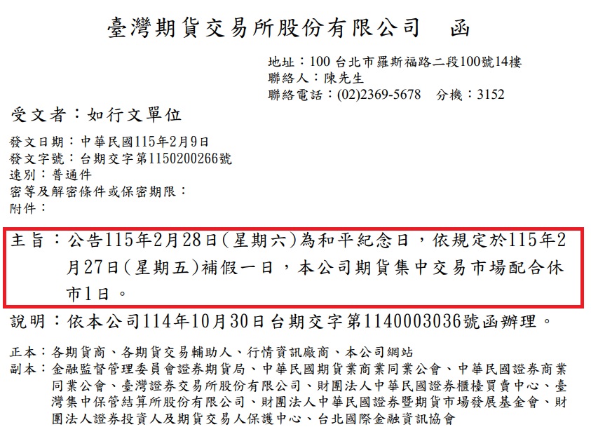 【台灣期交所】公告→2026年2月27日(星期五)和平紀念日