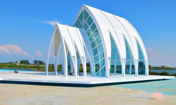 以鹽的白色為主色調,取結晶鹽的晶瑩剔透為其發想,結合曾經撫慰無數烏腳病患的教會意念,乃有水晶教堂此名。