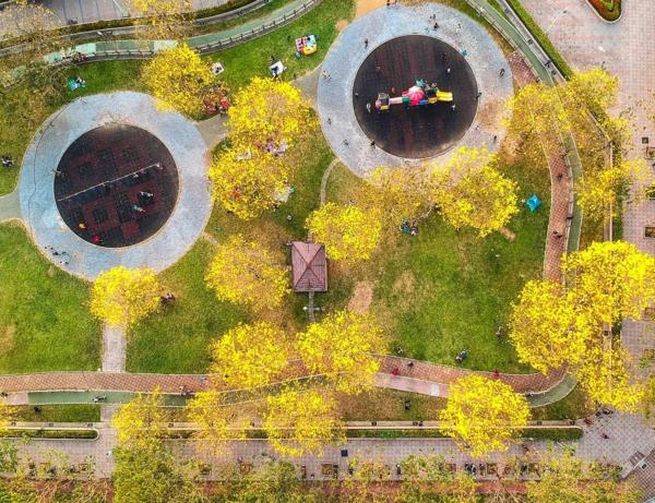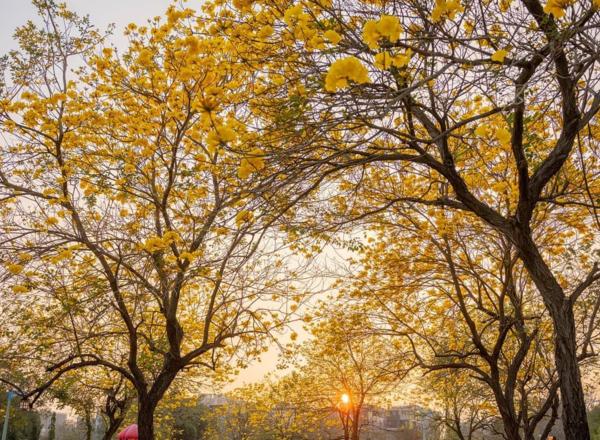 今年花況迅速達到高峰,黃花風鈴木花幾乎全數滿開,有網友更引用電影名句來形容:「滿城盡是黃金樹」,漫步公園彷彿陷進一片浪漫黃金雨中。
