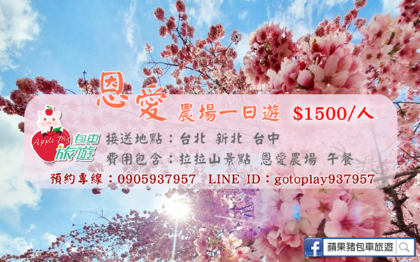 賞櫻的季節只到4月初而已.... 現在出發還來得及!! 台中蘋果豬包車旅遊規劃拉拉山賞櫻一日遊行程 自行組團4人或8人一車 1500/人(含一餐) 出發地點: 台中 台北 新北 預約專線:090593...