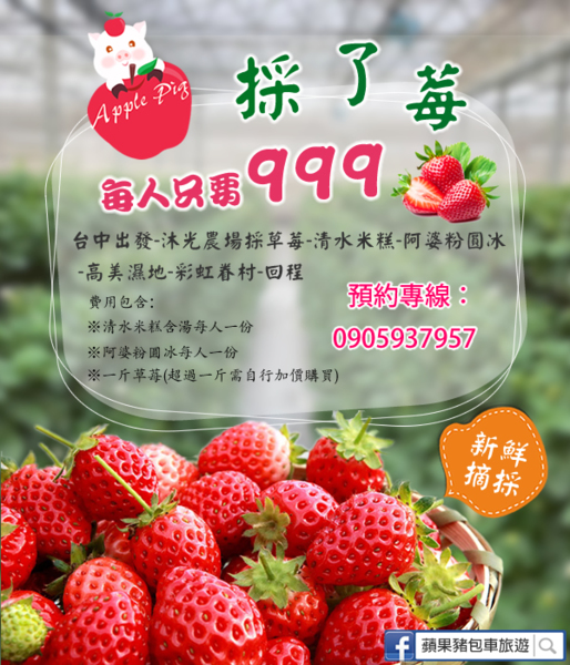 📢來喔來喔!! 今年採了莓🍓?? 台中蘋果豬包車旅遊要帶你採草莓、吃米糕、吃粉圓冰 還有.....高美濕地看夕陽🌅 ,時間來得及的話夜遊彩虹眷村。 🚍 專車接送『每人只要999』👏👏👏 ...