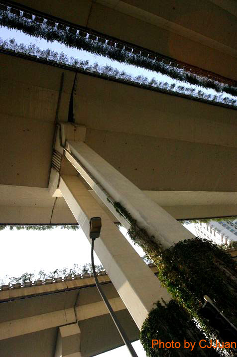 車子走在市內, 很多時候看不見天空. 尤其在環狀道路的底層, 往上望見的是直線, 曲線和零零碎碎的背景. 環狀道路的設計概念, 大概不包括優美吧? 面對這樣的景象, 心中一動, 照相機馬上拿起來.