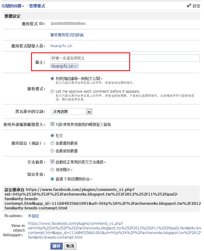 以上的步驟和程式碼,我是參考最新官方網站的步驟去實做的,保證2012年底前有效,之後若臉書老大不爽又有變動,當然以官方為準囉!如果你是參考其他網站比較舊的教學文章,就會卡關在怎麼設定都無法出現那行「設定」,其最關鍵的原因是其他教學網站都會要你在步驟5.的地方多了 expr:href='data:post.url' 這屬性去指定目前的網址位置,而新版的 Facebook SDK 已經會自動抓取目前網址位置了,多設了這屬性,反而會與應用程式ID不合而導致無法連結到應用程式產生管理模式!(應該是這樣沒錯!)