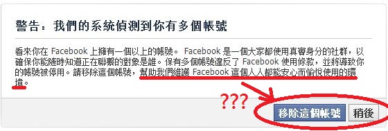 系統偵測我有多個帳號?是有多少個?這個帳號是我從2009年6月16日起一直用到現在的帳號阿!我除了偶爾進去餐城點一下以外,也沒玩啥小遊戲需要多開分身套利,何需要開多個帳號分身?我連一個帳號都自顧不暇,每個朋友的近況動態都無法一一兼顧,怎麼可能有時間有心力有本事去開多個帳號?況且我又不玩遊戲開了到底要幹嘛阿?!難道是要養小三用嗎? XD