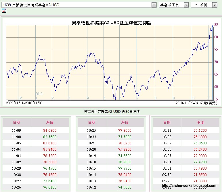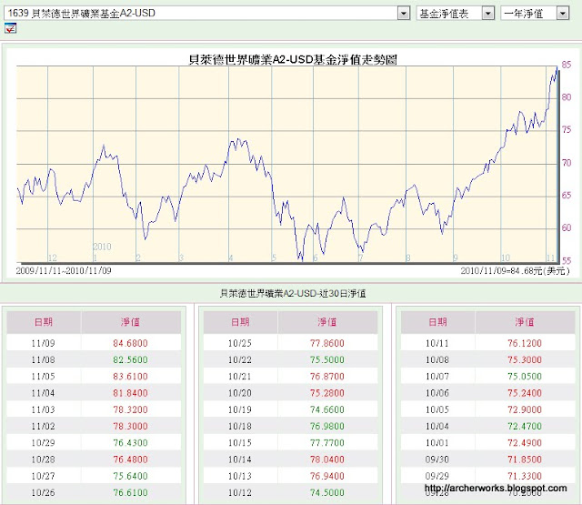 早在三四年前我就有買過這支「明牌」基金了,我知道這是美金計價的,都先在匯率較有利的時候先換美金,再直接用美金買這支基金,將來淨值上漲到達停利點時可以先贖回到美金帳戶,等待匯率漂亮時再換回台幣,如此一來,基金買賣時的匯率是可以自己控制的,藉此可大幅減少匯損的風險。當時本金少少,賺了20趴約末500美金我就跑了。之後在稍低一點的時後我又開始了這支的「不定期不定額」。隨著一路走貶的美金,和一路飆升的原物料、貴金屬所賜,最近幾天(如上圖,截至11/09淨值),他又悄悄來到了一年多的新高點,84.68,我看著我定期定額兩年多的投資報酬率變成了+40%左右,思忖著到底該不該贖回的考量(畢竟我贖回後還是parking在美金,不會強制換回此時匯率不漂亮的台幣),遂寫了這篇提醒大家一下,檢視一下手上的基金報酬。