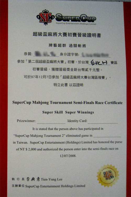 本來只想說,第一回合就會被淘汰...可以跟老婆看看電影,結果這樣一直打牌打到五點半.接續頒證書..一直到六點半...連停車費都花了我6百多元(因為我們後來還是去看了「微光城市」)..真是累阿...比考試還累..我老婆也很累..逛街逛的很累....