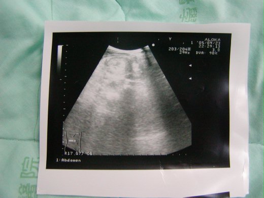 從九月21晚上開始,他告訴我肚子有點痛,我心想:「不會吧!」上完廁所以後就好多了,雖然晚上睡得不是很安穩,並沒有出現很嚴重的症狀,22、23日白天都還能去上學,直到23日下午下課後,精神顯得有一點疲倦,還會出現間歇性的疼痛,因為有三年前的經驗,就直覺情況不太妙,懷疑有腸套疊的可能性,勉強他吃完晚餐以後就帯到醫院掛急診檢查,問診填的就是「疑似腸套疊」,值班醫生還起初還不敢斷定,先是讓他照X光,本來他很勇敢,要自己一個人在放射室,在最緊要關頭竟放聲大哭起來,等待的同時和他溝通,「等一下媽媽陪你進去,你要乖乖照相,相片會在電腦送到醫生叔叔那裡,你就可以看到你的肚子,還有上面的小排骨喔,本來大人不能進去,可是醫生說你很乖,才讓媽媽進去陪你。」「可是他們大人有進去啊」「因為他們和你一樣都很不舒服,所以才要進去,你看他們都是一個人進去,對不對」點頭:「因為你是我的媽咪,所以他們才讓你進去哦?」「對啊」「你陪我一起照。」「不行,只有你才可以照,媽媽只能陪你而已,不能照。」終於說服了他,像老鳥一樣,一進去就把兩手張開,貼近面板,終於順利的趙完X光。片子顯示有宿便,通浣腸之後還是直叫肚子痛,接著才照超音波,起先他非常抗拒,一直想擦掉塗抹在身上的液體,等到他看到超音波影像時,醫生告訴他有問題的地方,就是左上角那個長的有點像甜甜圈的圖案,他才停止哭泣,還向醫生要了一張回家作紀念。