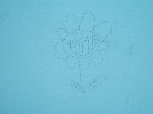 一天,回到家,看到房間外多了壁畫。婆婆唸著小朋友都亂畫。本來要順著她唸一下的,結果把鈞鈞叫來,跟她說:你今天完得很開心哦?她笑答:對呀!然後我把她抱起來親親。我的這一轉是因為看到那壁畫她畫了自己和一朵朵的向日葵很開心的笑,笑到我心坎裡了。