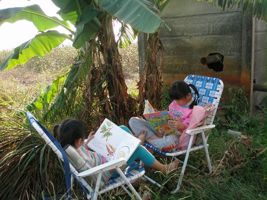 後面有個破舊的幫浦寮,就著香蕉樹下剛好晒不到太陽。看吧!一幅超悠閒的畫面,兩個小朋友竟很認真的看著書,而我就在一旁除草,一邊聽著妹妹讀出的內容,心想她的拼音進步很多。